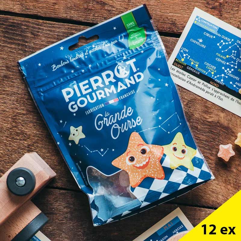 Explorez les étoiles autrement avec les bonbons étoiles Pierrot Gourmand ! Offrez-vous un voyage gourmand à travers les constellations avec notre assortiment de confiseries en forme d’étoiles, brillantes et délicatement acidulées. Inspirés par la Grande Ourse, Cassiopée, Pégase ou encore Andromède, ces bonbons ludiques et sans gélatine émerveillent petits et grands passionnés du ciel. Une expérience sucrée et éducative signée Pierrot Gourmand, parfaite pour allier plaisir et imagination.