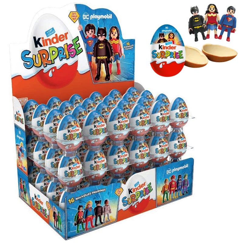 Le fameux oeuf en chocolat délicieux de Kinder avec comme suprise à l'interieur un des super-héros emblématiques et des méchants de DC au format Playmobil. La collection Playmobil se compose d’œufs Kinder Surprise avec 16 figurines différentes